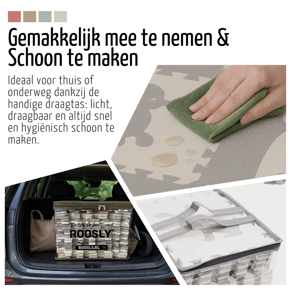 Veilig en Gemakkelijk Schoon te Houden: Ons EVA-schuim is duurzaam en waterafstotend, waardoor het gemakkelijk te reinigen is. Je kunt het eenvoudig afnemen met een vochtige doek, en dankzij de opstaande randen blijft speelgoed op zijn plaats.